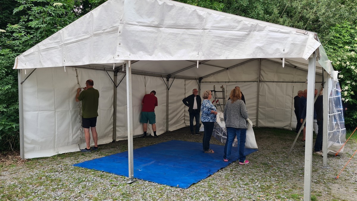 Bewährte Maßnahme: Ein Festzelt für alle Teilnehmer. In Anbetracht der unklaren Wetterverhältnisse hat sich ein solches Zelt schon oft bewährt. Es bietet für alle Teilnehmer einen zentralen Treffpunkt für interessante Gespräche bzw. Kennenlernen
